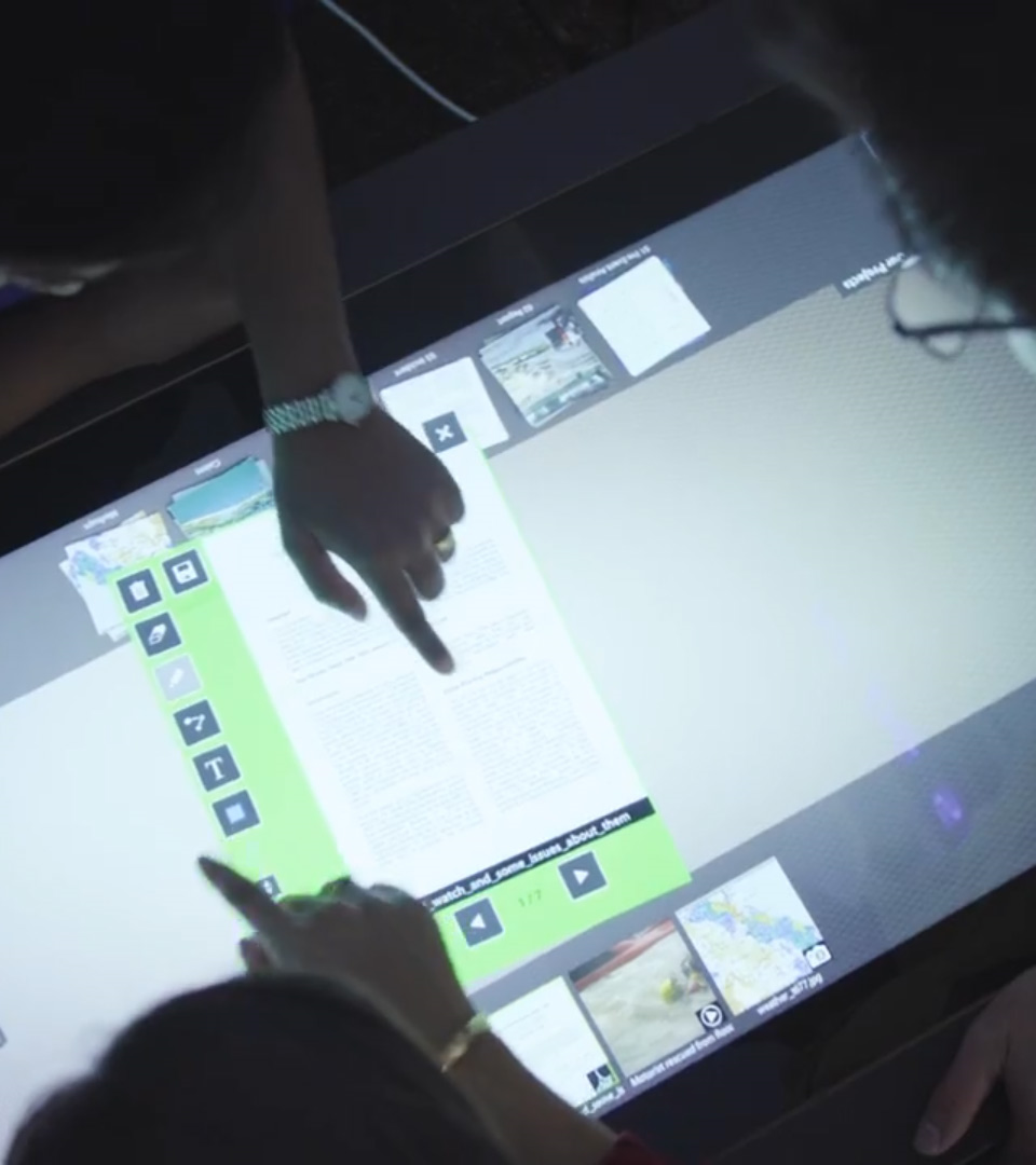 Comprised of a large multi-user & multi touch table device with a secondary display screen and connection hub